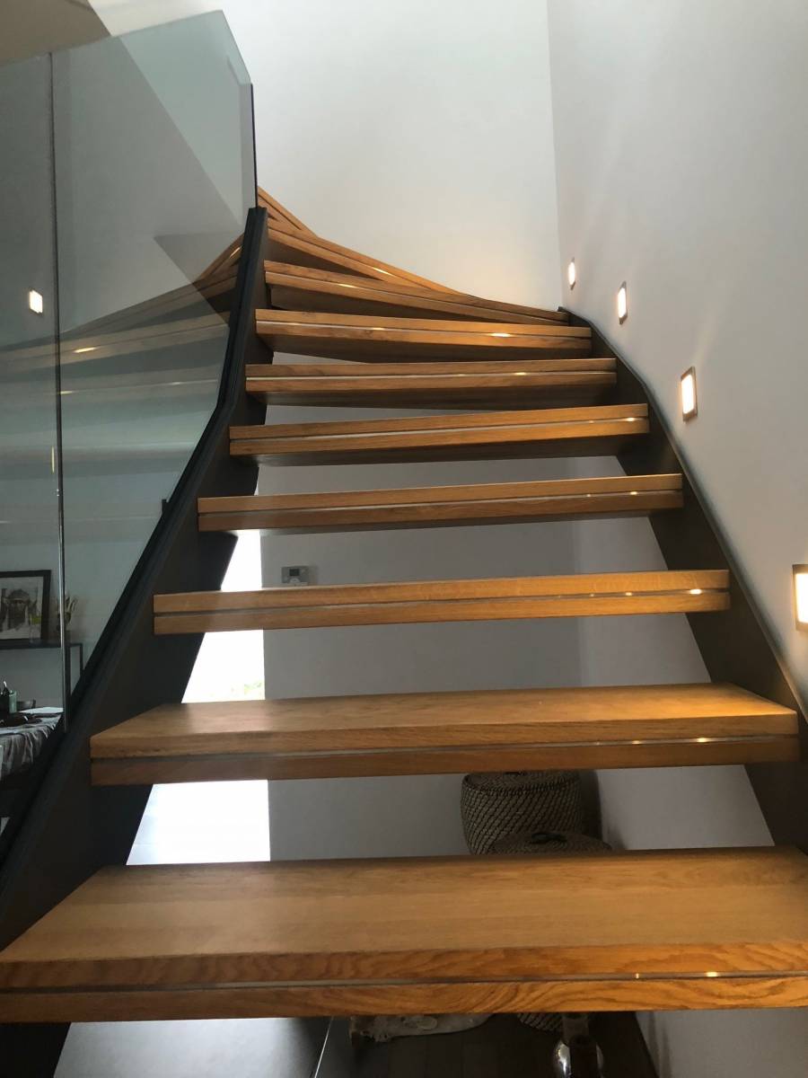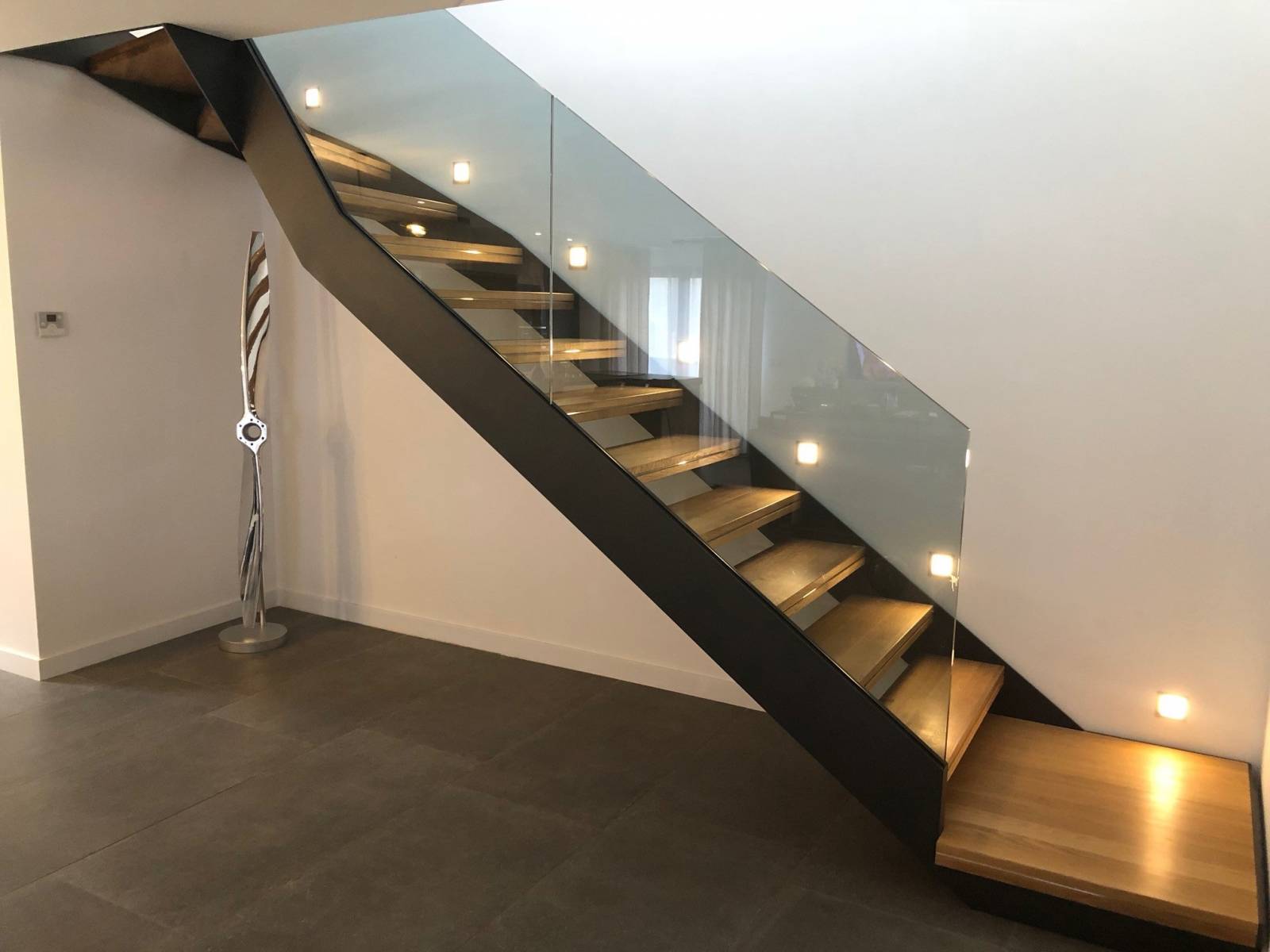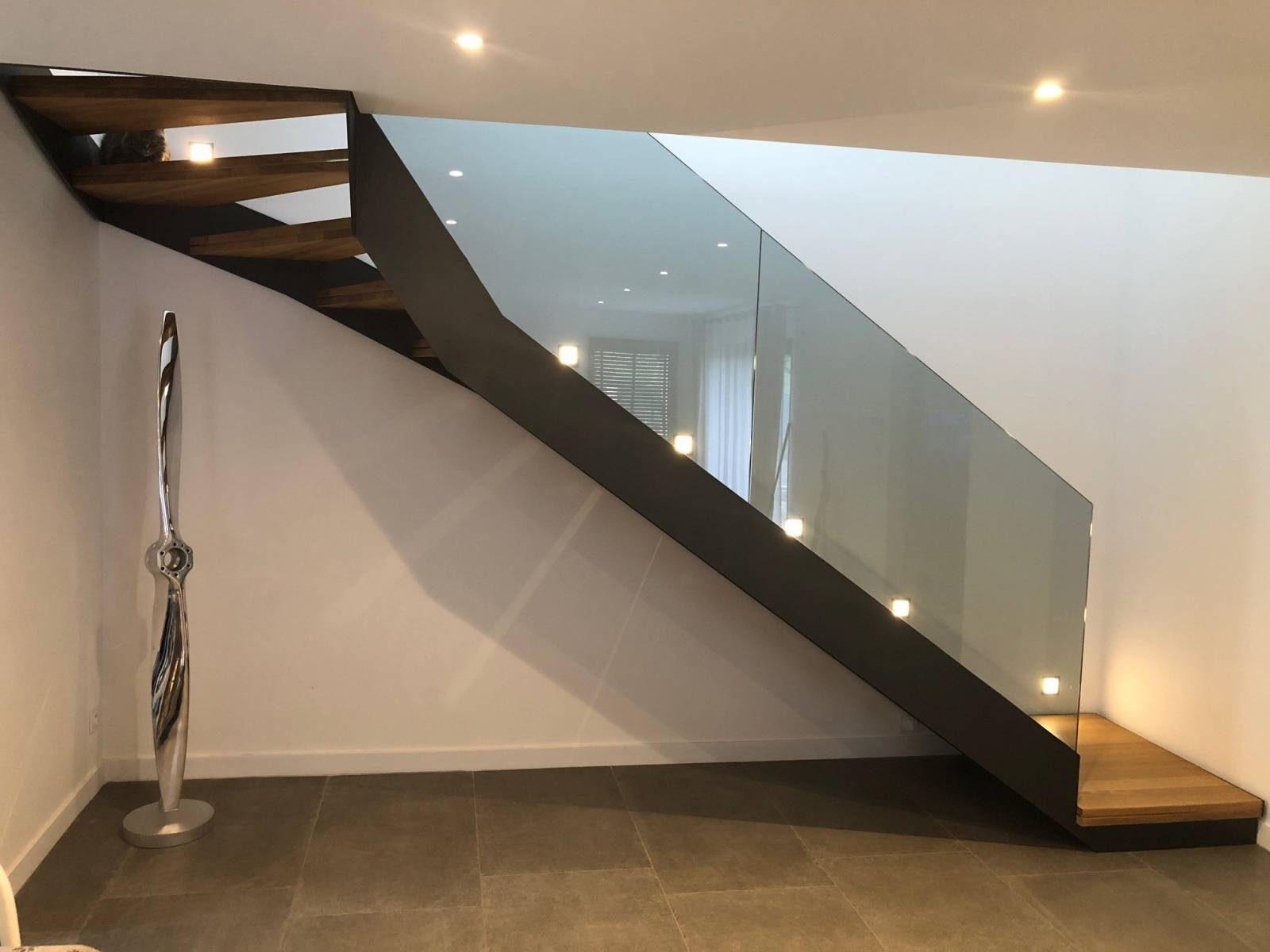 Dans le cas précis la demande du client était de concevoir un escalier en double marche sans support visible .la mise en ouvre de cette ouvrage a été possible grâce a l'adaptation de structure acier cacher . au préalable une conception 3D est proposé a nos clients , ce qui permet de valider l'aspect visuel et technique de l'escalier et des garde corps . Une structure en profil aluminium permet le maintien du vitrage trempé auto-porté 10.10.3