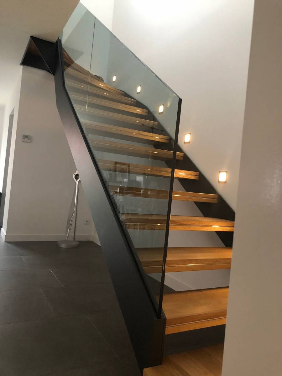 ESCALIER MÉTAL ET VERRE AVEC MARCHE EN CHÊNE A LYON