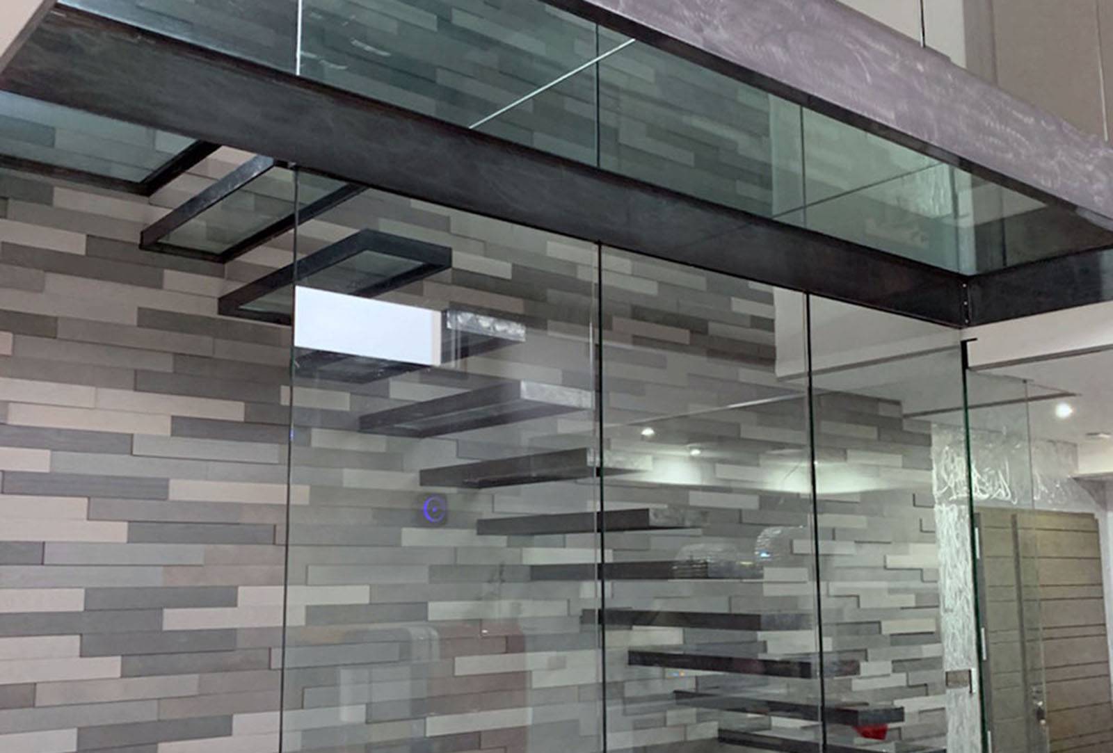 Pour obtenir des marches suspendues nous avons conçu et créé sur-mesure une structure acier permettant d’assurer le maintien des marches suspendus en toute sécurité qui devient totalement invisible une fois le doublage et la finition du mur fait. Les marches sont composées d’une structure en acier soudé sur laquelle vienne se reposer les marches en verre trempé d’une épaisseur de 21 mm . 3 gros vitrages viennent compléter l'ouvrage sur toute sa hauteur et servent de garde-corps rampant. L’ensemble de l’acier brut a été vernis.