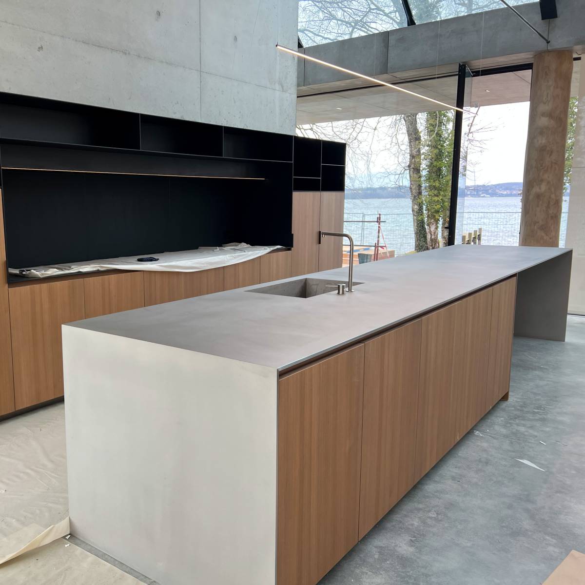 Cet ilot Il à était réaliser en une seule partie avec un raccord non visible, une cuve sur-mesure à été soudé à la structure en inox microbillé.