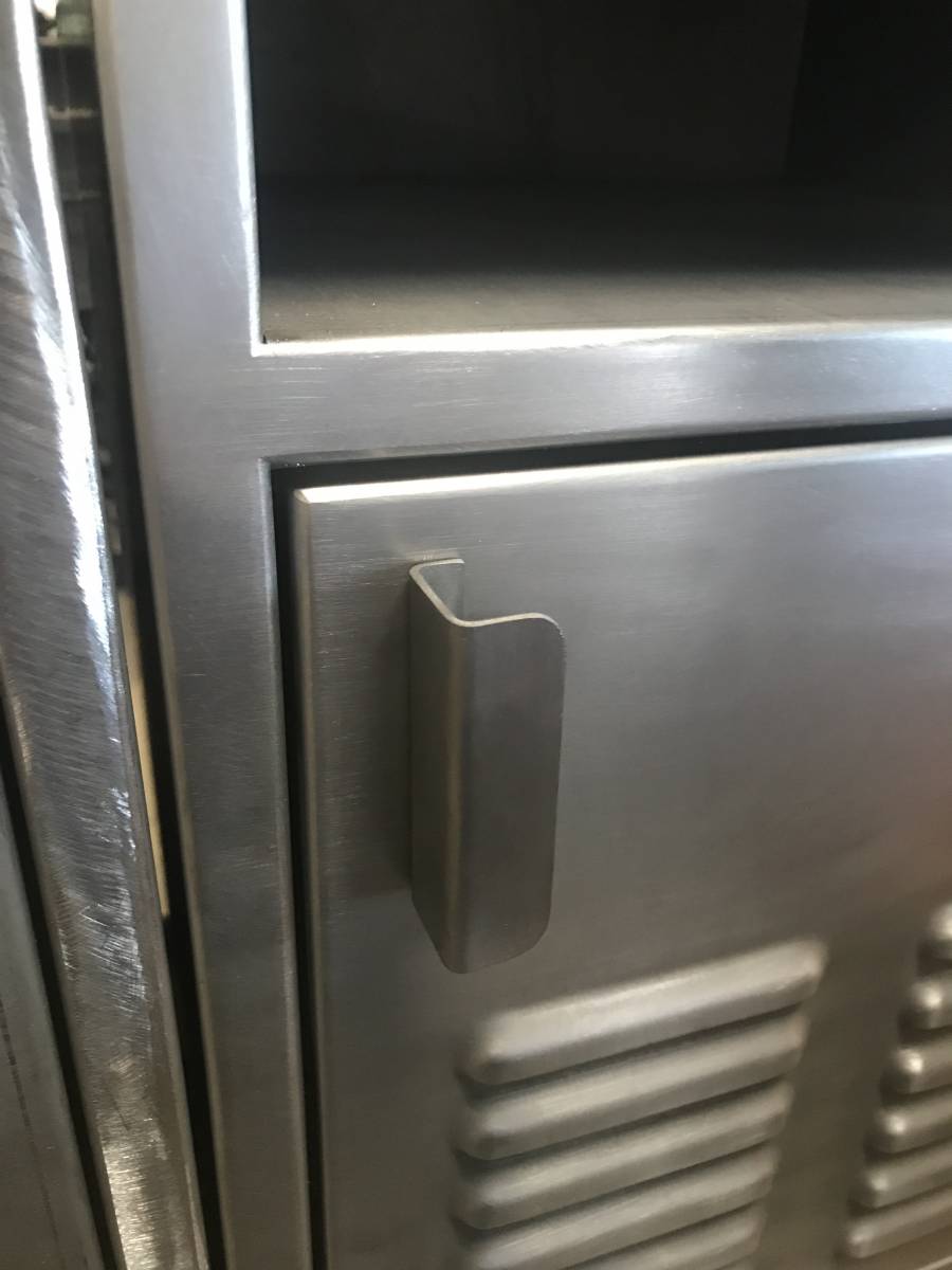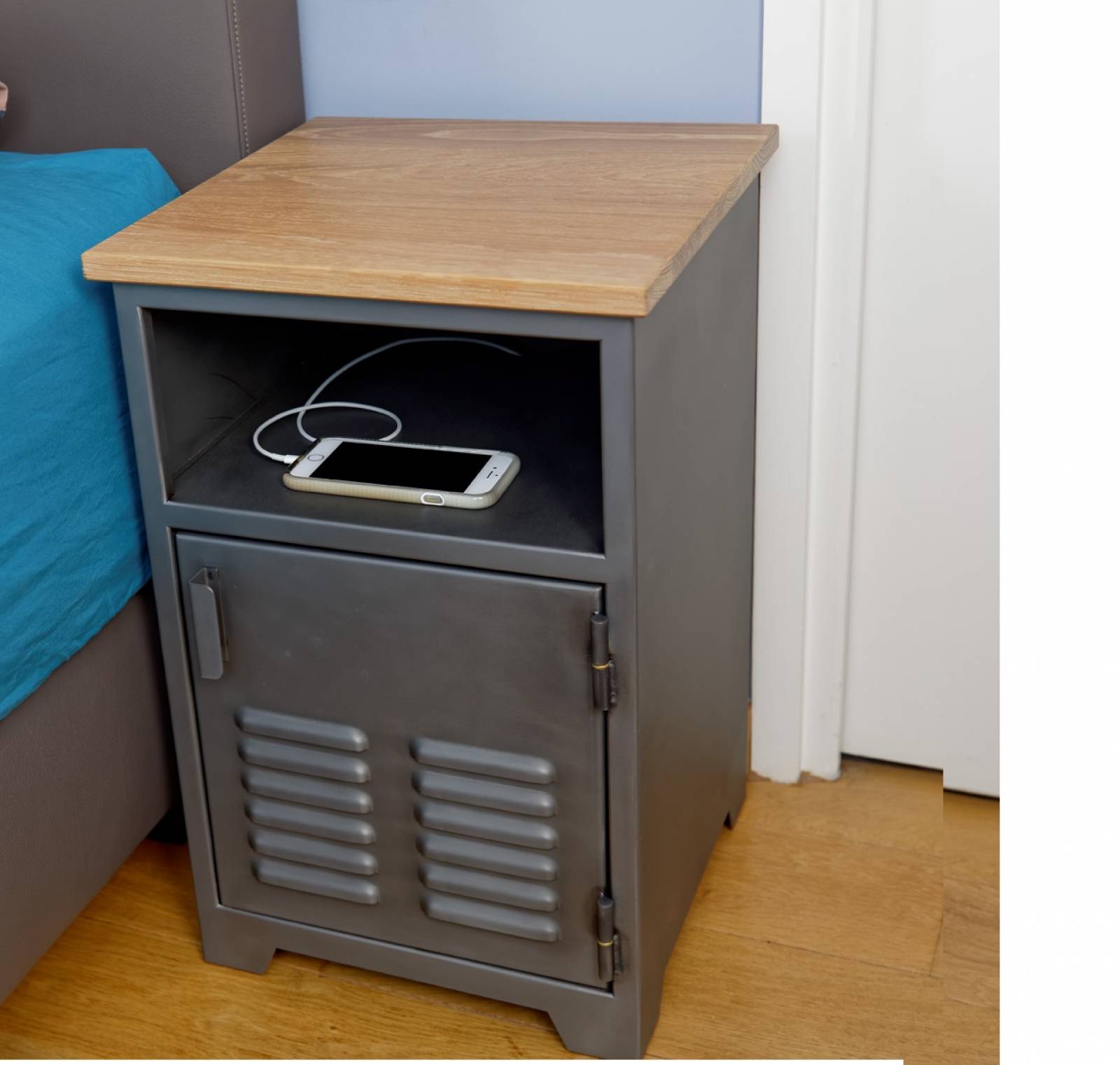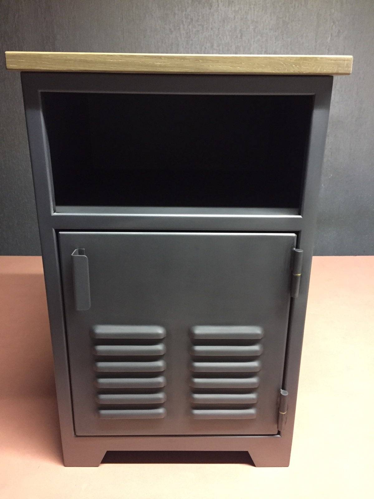 meuble acier type table de chevet en métal bois . le meuble est en tôle acier "épaisseur 1,5 mm . le plateaux en bois est en chêne huilé massif épaisseur 20 mm 1 porte sur paumelle garnit d’ouverture vintage prévu trous de passage de câble le meuble peux ce décliner sous différente finition et colorie , dans le cas présent le finition est un "métal brossé + vernis mat époxy".